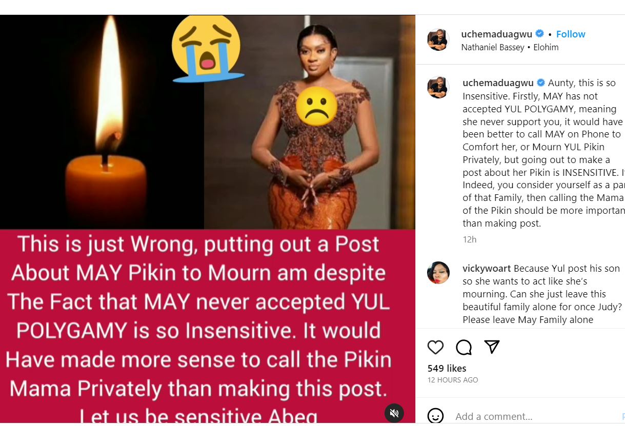 “Aunty, this is so insensitive. Firstly, MAY has not accepted YUL POLYGAMY, meaning she never supported you. It would have been better to call MAY on the phone to comfort her or mourn YUL Pikin privately. Going out to make a post about her Pikin is INSENSITIVE. If indeed you consider yourself as a part of that family, then calling the Mama of the Pikin should be more important than making a post.”